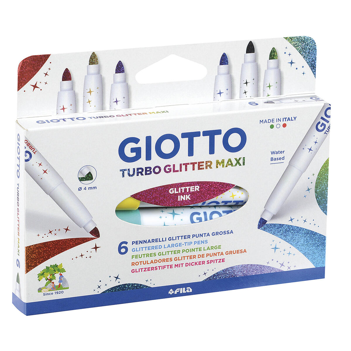 6 st/fp. Vattenbaserade fiberpennor med fin glittereffekt, i 6 olika färger. Med ventilerad huv och extra hållbar spets. Spetsbredd 4 mm. PVC-fri. Från 3 år.