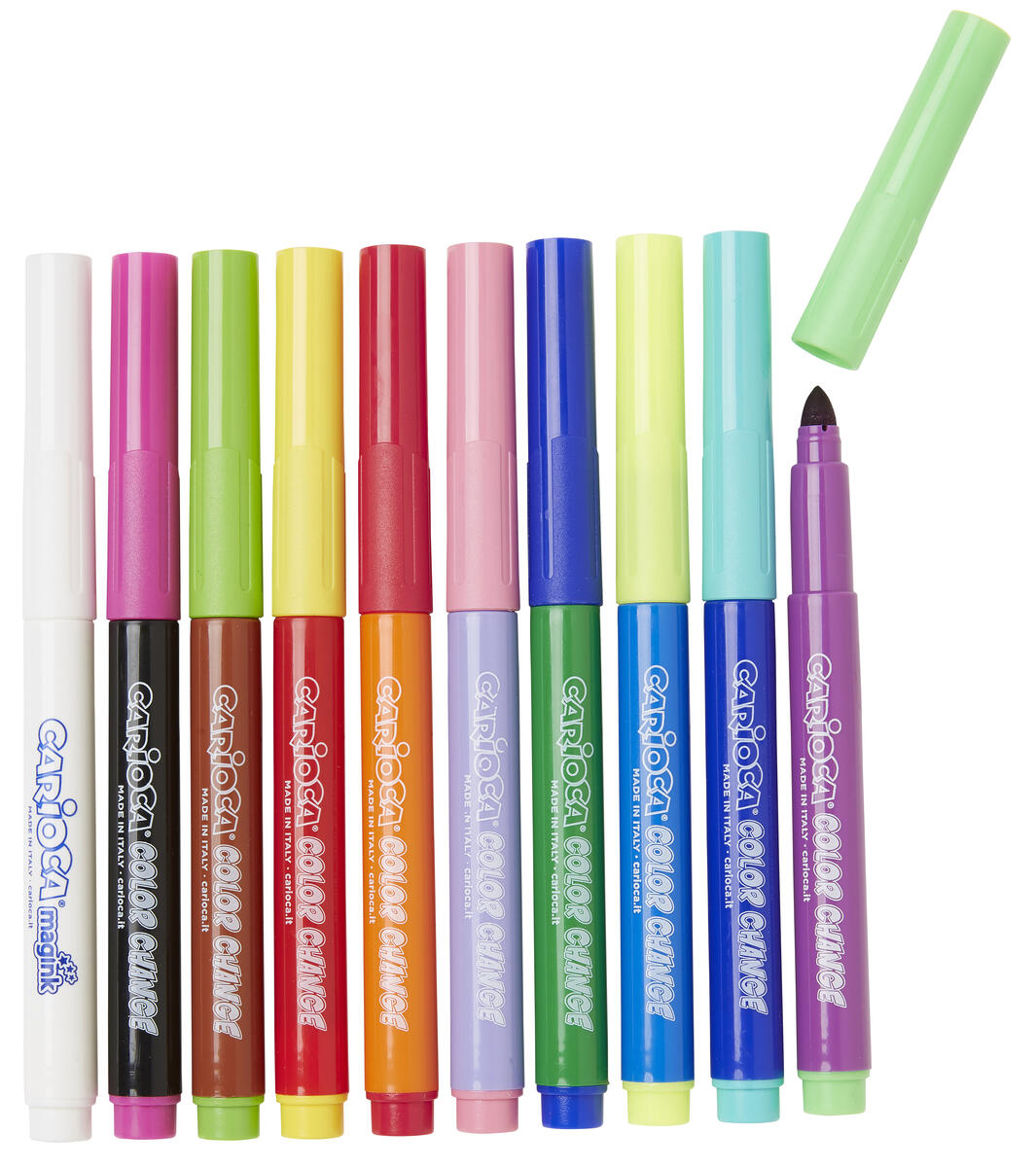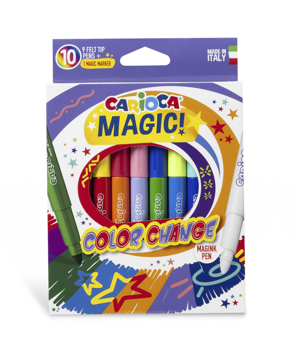 10 st/ask. Magiska pennor som ändrar färg. Måla först med färgpennorna och måla sedan över med medföljande specialpenna. Färg ändras då till den färg som finns på pennans kork. Innehåller 9 färgpennor i olika färger + 1 specialpenna. Ventilerad huv och säkrad spets. Längd 145 mm. Spetsbredd 6 mm. PVC-fri. Från 3 år.