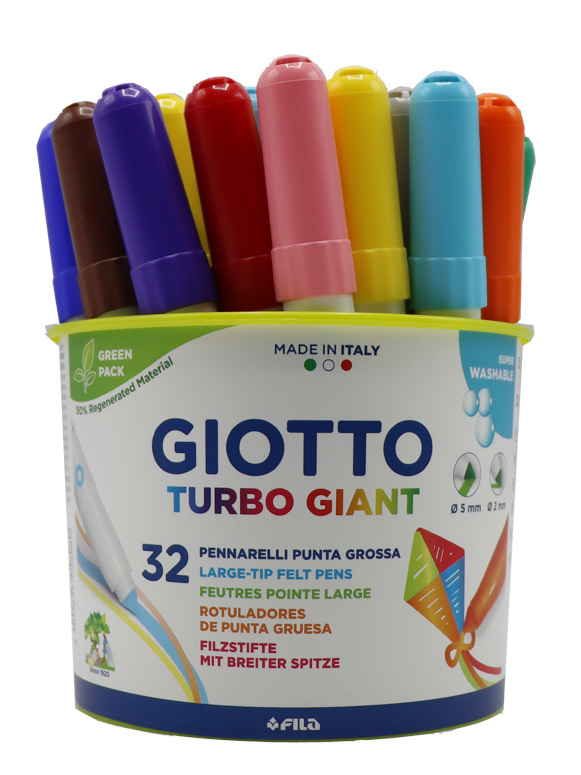 32 st/fp. Extra tjocka fiberpennor av hög kvalitet med en extra tålig och åtsittande spets. Ventilerad huv med säkerhetsplugg som gör den kvävningssäker. Giftfritt vattenbaserat bläck som går lätt att tvätta av från de flesta textilier i maskintvätt 40 °C. Tvättas av från huden med tvål och vatten. Längd 148 mm. ø 15 mm. Spetsbredd 11 mm. Linjebredd från 2 mm. Innehåller gul, orange, röd, rosa, lila, ljusblå, blå, ljusgrön, grön, brun, grå och svart. 3 av varje färg. PVC-fri. Från 3 år.