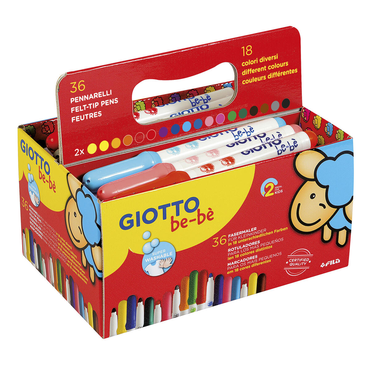 36 st/fp. 12 färger, 3 av varje. Extra tjocka fiberpennor som passar även för de minsta barnen. Säkra och lätta att använda och tvättas lätt bort, både från kläder och från huden. Ventilerad och kvävningssäker huv och spetsen sitter fast och kan inte tryckas in. Dermatologiskt testade. PVC-fri. Från 2 år.