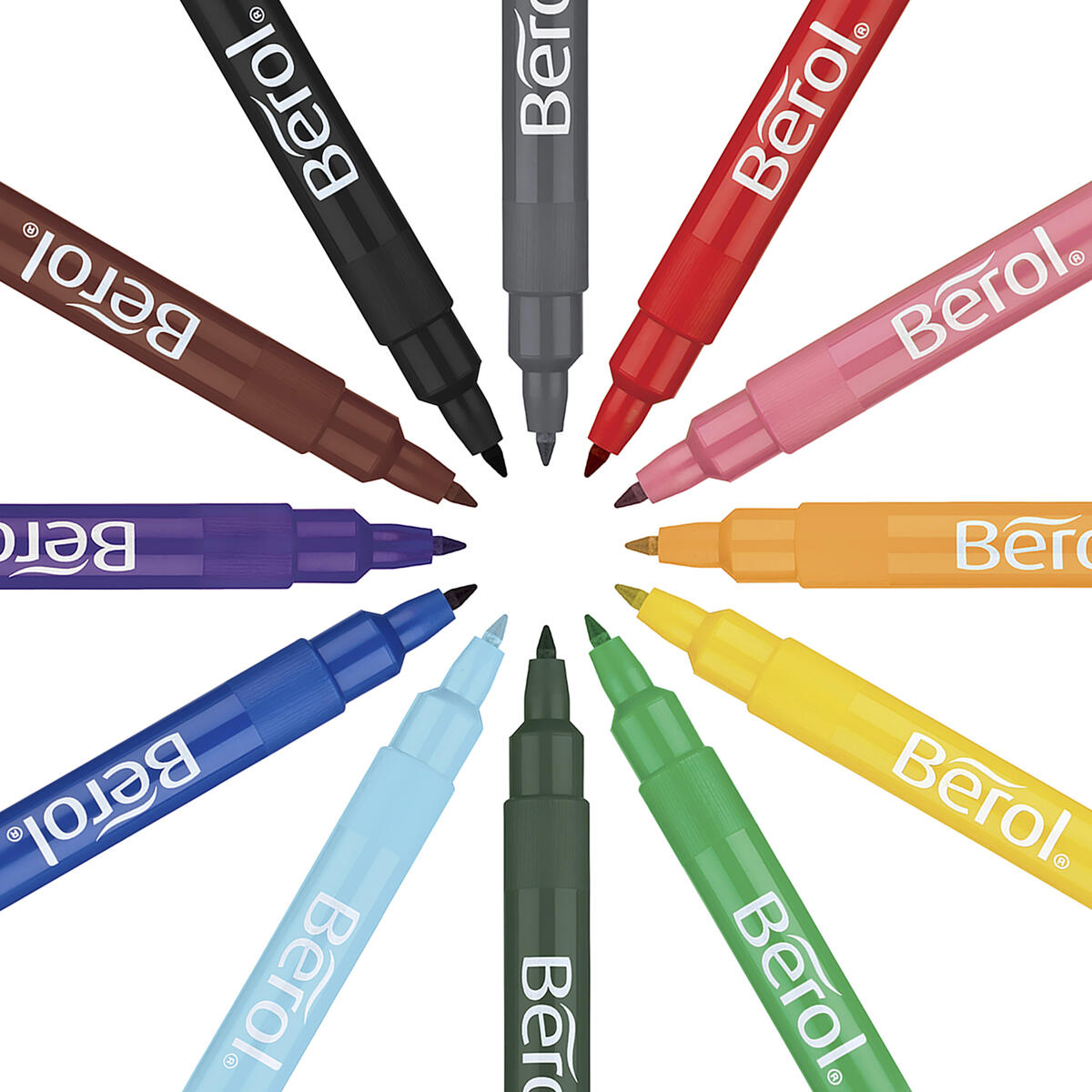 12 st/fp. Fiberpennor från Berol av hög kvalitet i 12 klara nyanser. Innehåller gul, orange, röd, rosa, lila, blå, mörkblå, ljusgrön, grön, grå, brun, svart. Tålig, bred och rundad spets. Flödigt bläck som passar färgläggning av lite större ytor och inte blöder igenom ritpapper. Ventilerad huv och pennkropp av plast, i samma nyanser som bläcket. Pennan kan ligga utan huv i upp till två veckor utan att torka ut. Bläcket kan tvättas bort från kläder, men skydda alltid underlag och textilier vid användande. CE-märkta. PVC-fri. Från 3 år.