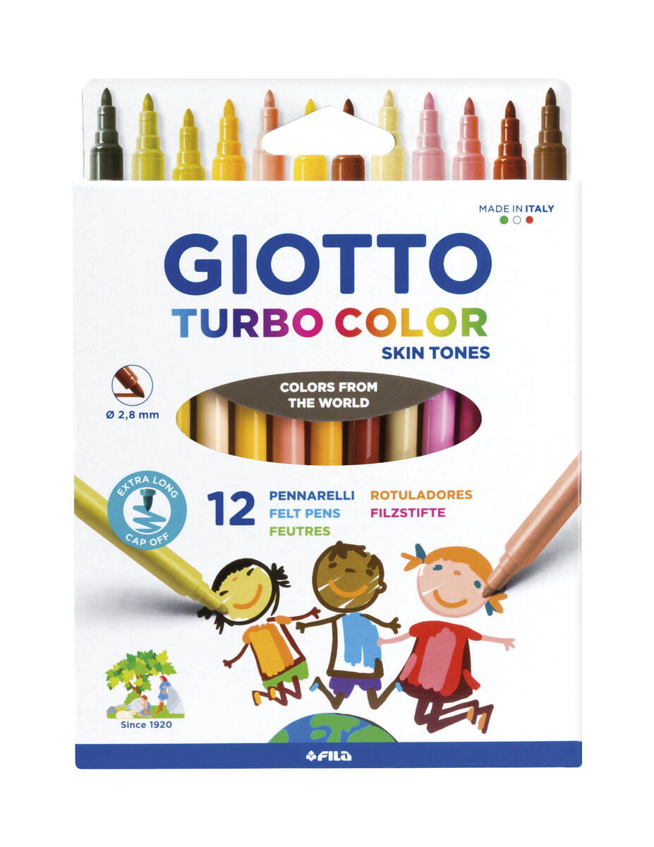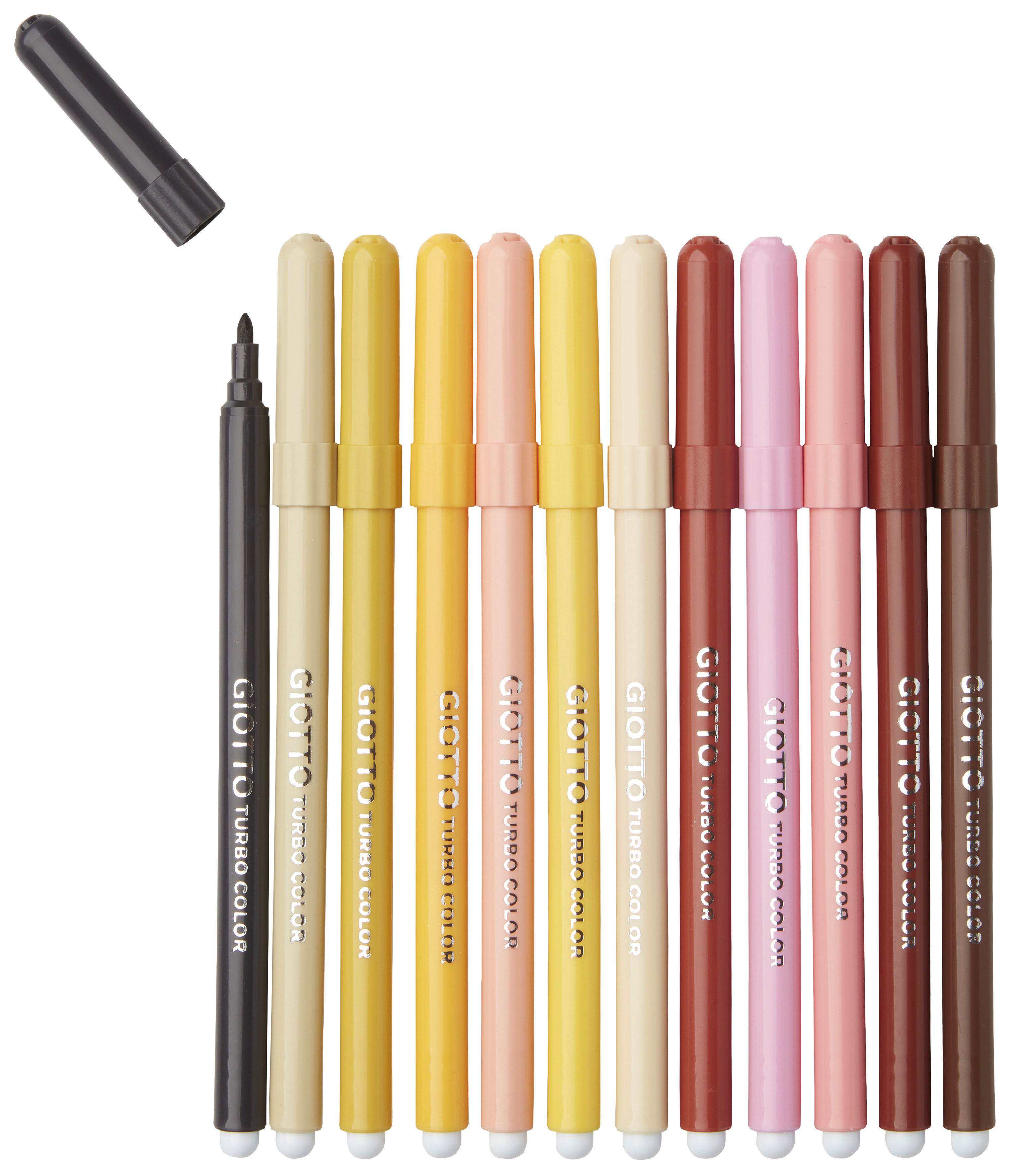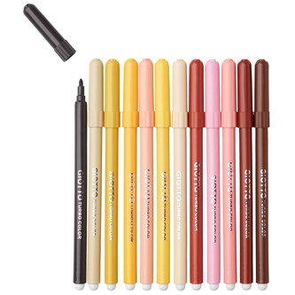 12 st/fp. Smala fiberpennor i hudtoner, med tålig spets som inte kan tryckas in. Ventilerad huv med säkerhetsplugg. Vattenbaserat bläck som går lätt att tvätta av från de flesta textilier. Tvättas av från huden med tvål och vatten. ø 2,8 mm fiberspets. PVC-fri. Från 3 år.