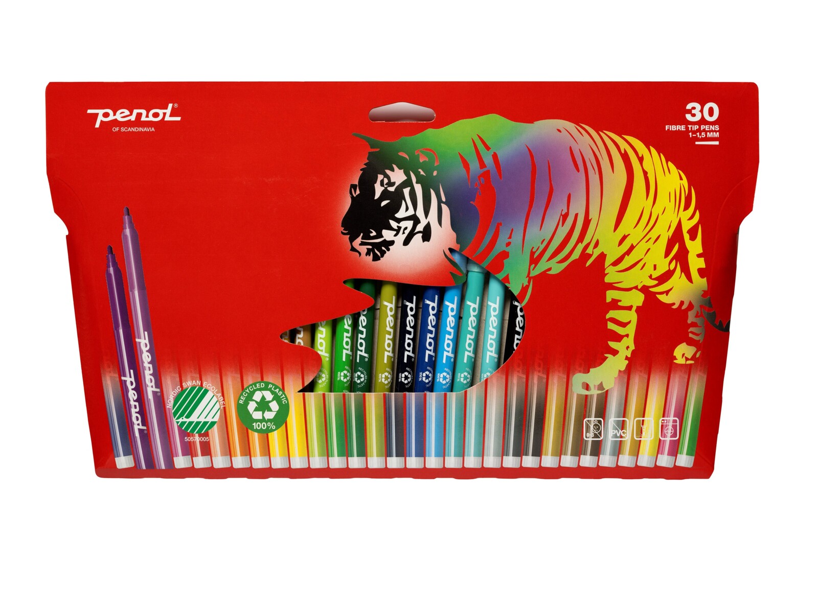 Smala fiberpennor av hög kvalitet i intensiva färger med en extra tålig och åtsittande spets. Spetsen går inte att trycka in i pennan. Ventilerad huv med säkerhetsplugg som gör den kvävningssäker. Vattenbaserat bläck som går lätt att tvätta av från de flesta textilier i maskintvätt 40 °C. Tvättas av från huden med tvål och vatten. Tjocklek penna: 8 mm. Tjocklek spets: 2,8 mm. PVC-fri. Från 3 år.