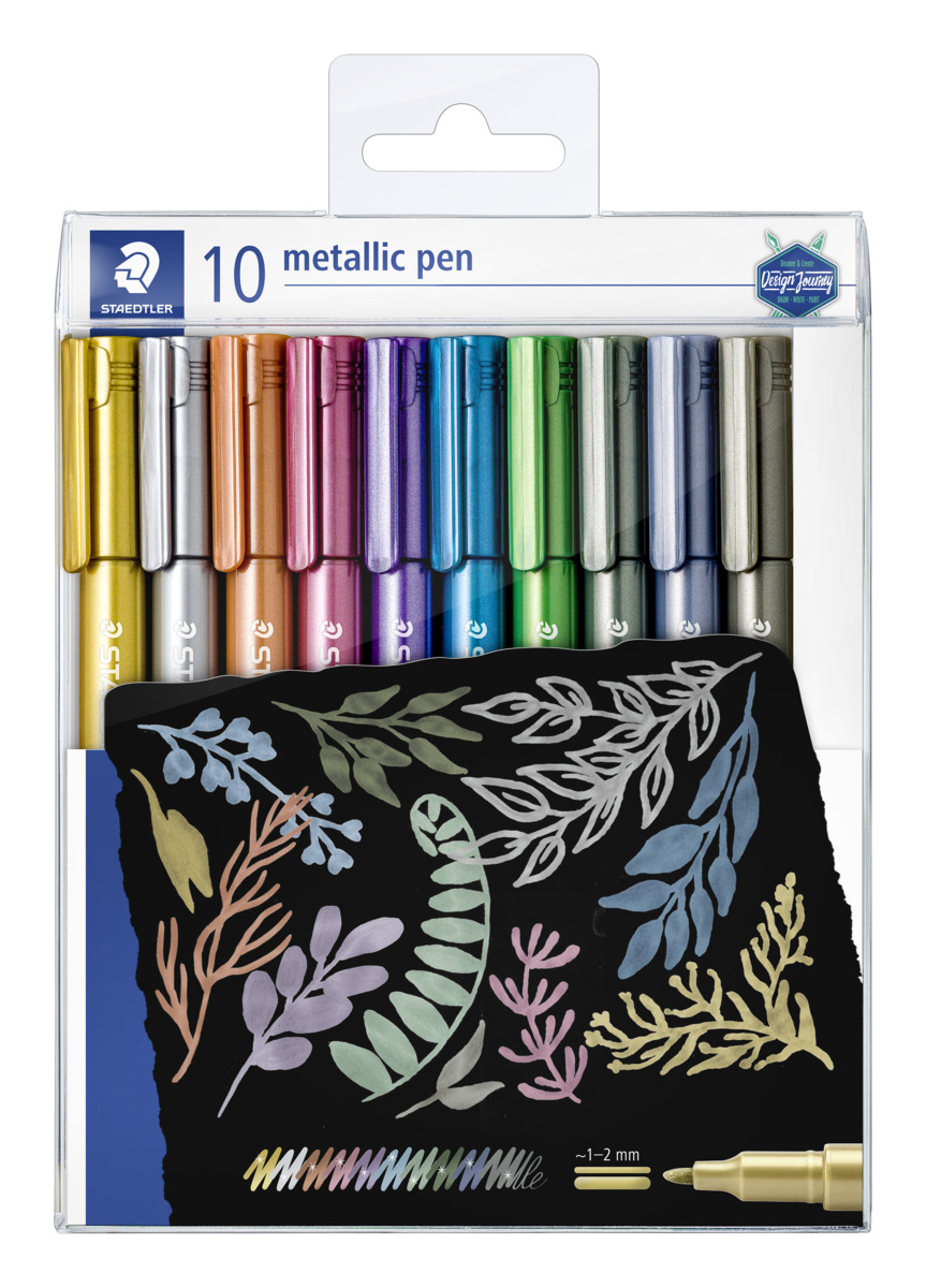 10 st/fp. Fiberpenna i 10 olika metallicfärger, för papper, kartong, glas m.m. Torkas enkelt av med fuktig trasa från glas och speglar. Linjebredd 1-2 mm.
