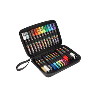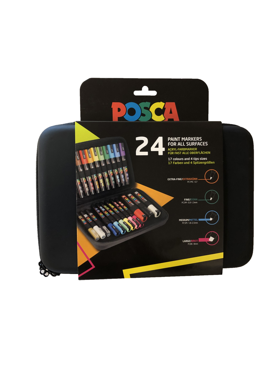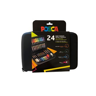 24 st/fp. Vattenbaserad permanent färgpenna som passar till de flesta underlag. Färgen torkar snabbt och blöder inte. Setet innehåller olika varianter enligt följande: 3 extra fine 0,7 mm: guld, vit, svart, 6 fine 0,9-1,3 mm: fuchsia, ljusgrön, rosa, gul, ljusblå, mörkblå, 12 medium 1,8-2,5 mm: äppelgrön, himmelsblå, grå, orange, brun, lila, gul, röd, mörkgrön, ljusblå, vit, svart, 3 large 8 mm: röd, vit, svart.
