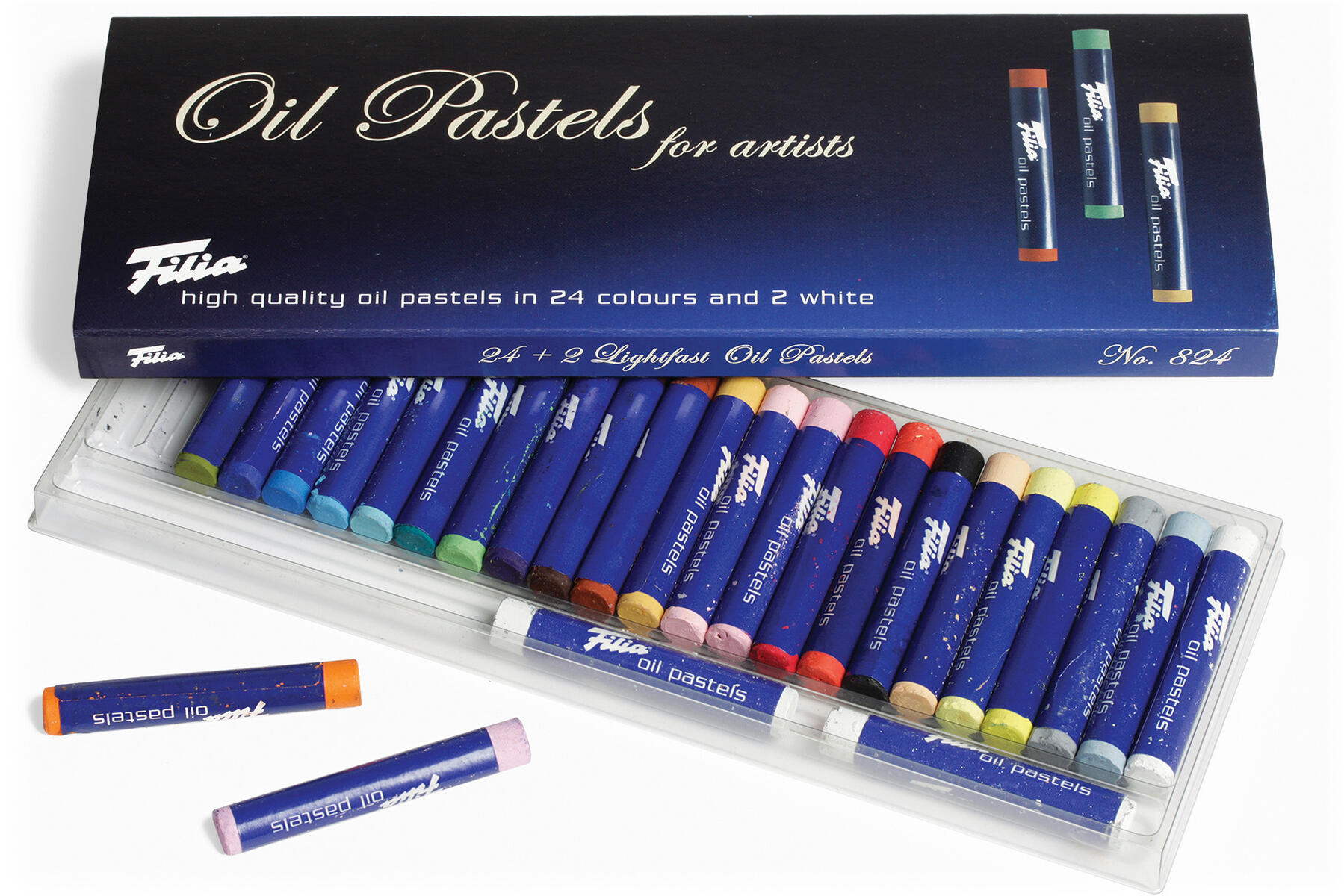 26 st/ask. 24 färger + 2 vita. Oljepastellkritor i mjuk kvalitet med hög pigmenthalt. Mycket god täckförmåga på bl.a. vitt och färgat papper och duk. Färgerna kan blandas på pappret för att skapa nya nyanser. Passar en rad tekniker. PVC-fri. Från 3 år.