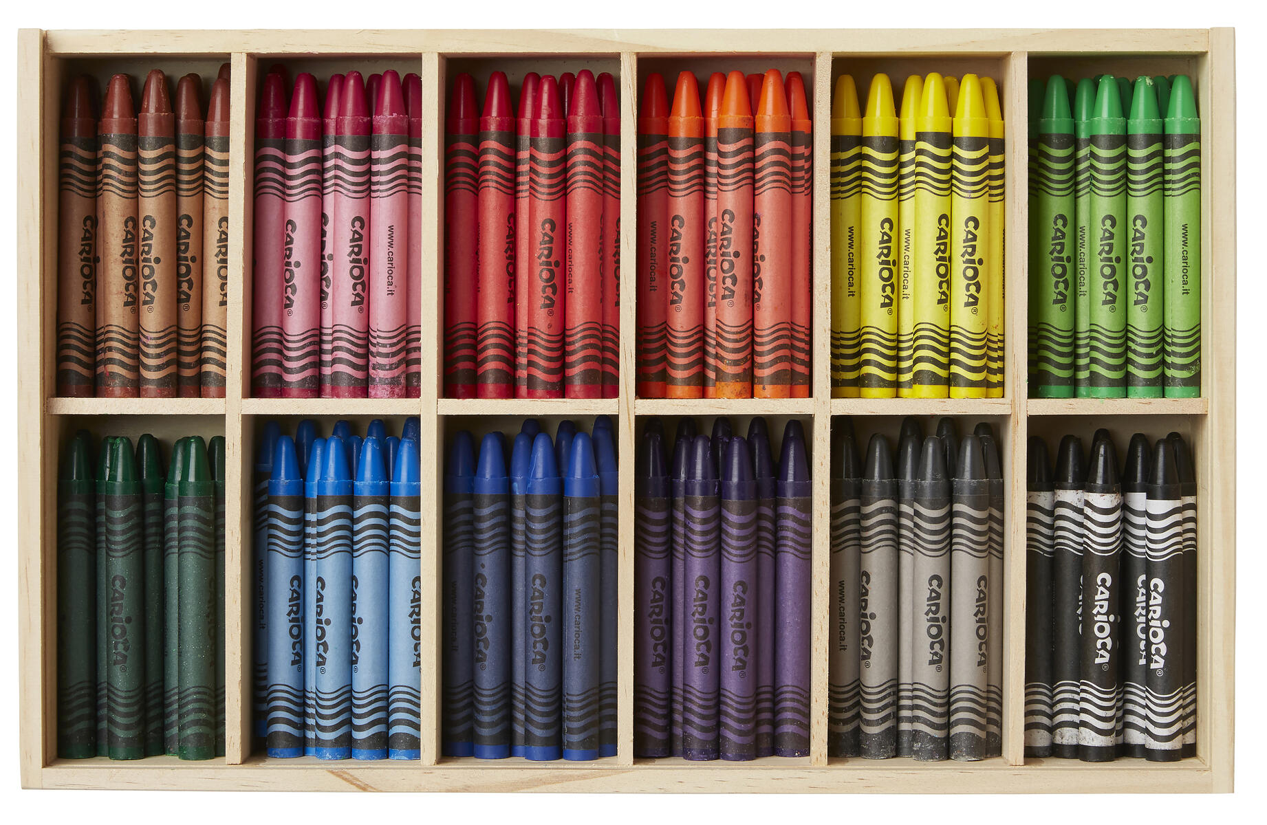 144 kritor/fp. Klassrumsuppsättning av våra kraftiga och greppvänliga vaxkritor. 12 kritor/färg av 12 färger. Ingår svart, brun, rosa, röd, orange, gul, grön, mörkgrön, blå, mörkblå, lila och grå. Kritorna levereras i en praktisk trälåda med lock. PVC-fri.