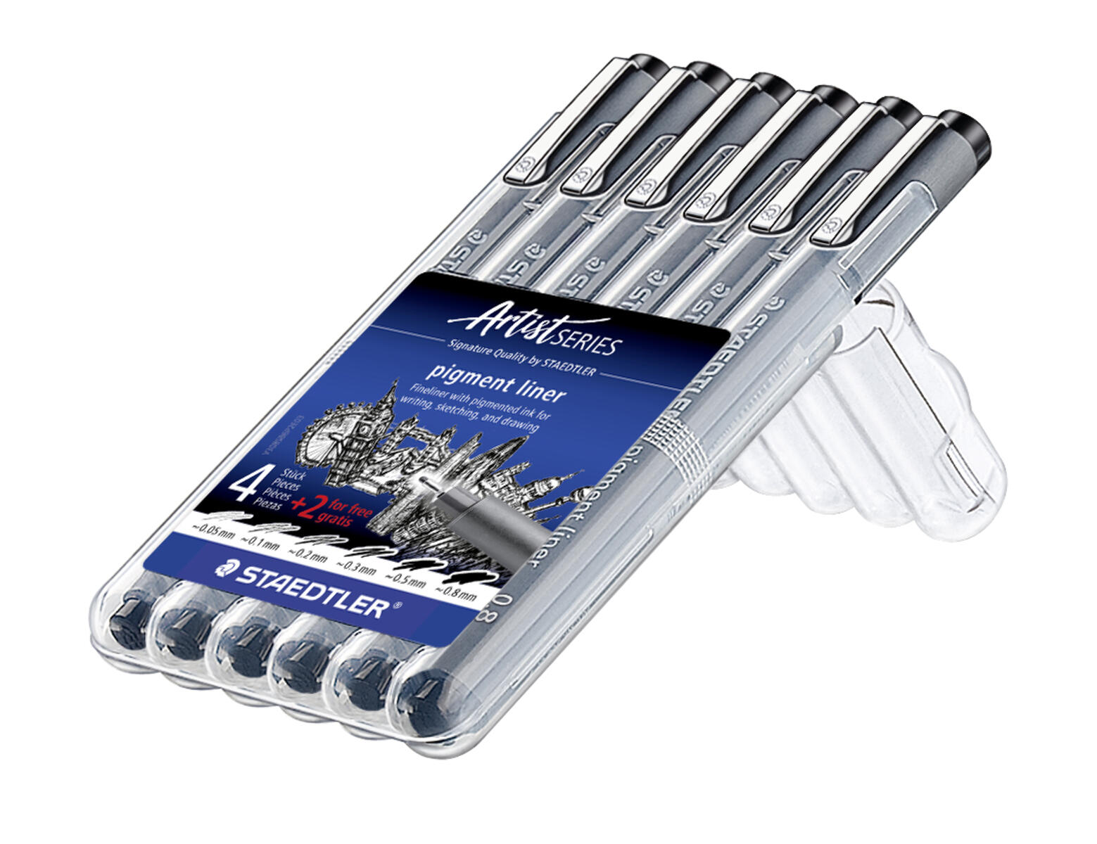 6 st/fp. Fineliner med fiberspets. Lämplig både för att skriva, skissa och teckna. Går utmärkt att använda med linjal. Svart vattenfast pigmentbläck som är syrafritt, ljusbeständigt och dokumentäkta. Kan vara utan kork i 12 timmar utan att torka. Trycksäker. Innehåller följande storlekar: 0,05, 0,1, 0,2, 0,3, 0,5 och 0,8 mm.