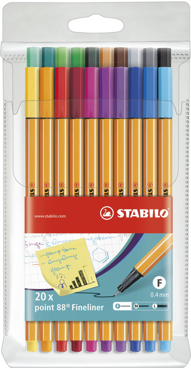 20 st/fp. Fineliner med vattenbaserat, luktfritt bläck. Metallomsluten skrivspets som ger tunna fina linjer utan risk för att färgen smetas ut. Lång "cap off"-tid, ventilerad kork. 20 olika färger. Spetsbredd 0,4 mm.