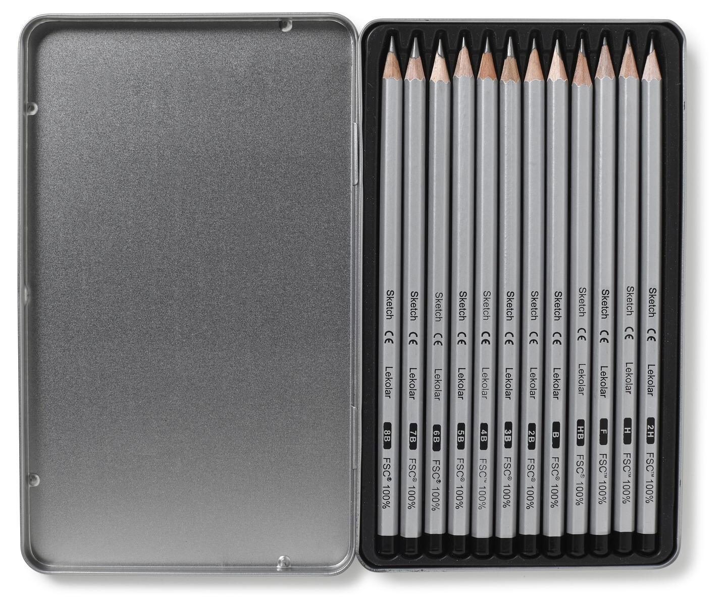 144 st/fp. Lekolar grafitpennor av hög kvalitet för blyertsteckning och teknisk ritning. Ingår hårdhetsgraderna 8B-2B, B, HB, F, H och 2H. 12 st pennor av varje hårdhetsgrad. Levereras i trälåda. PVC-fri.