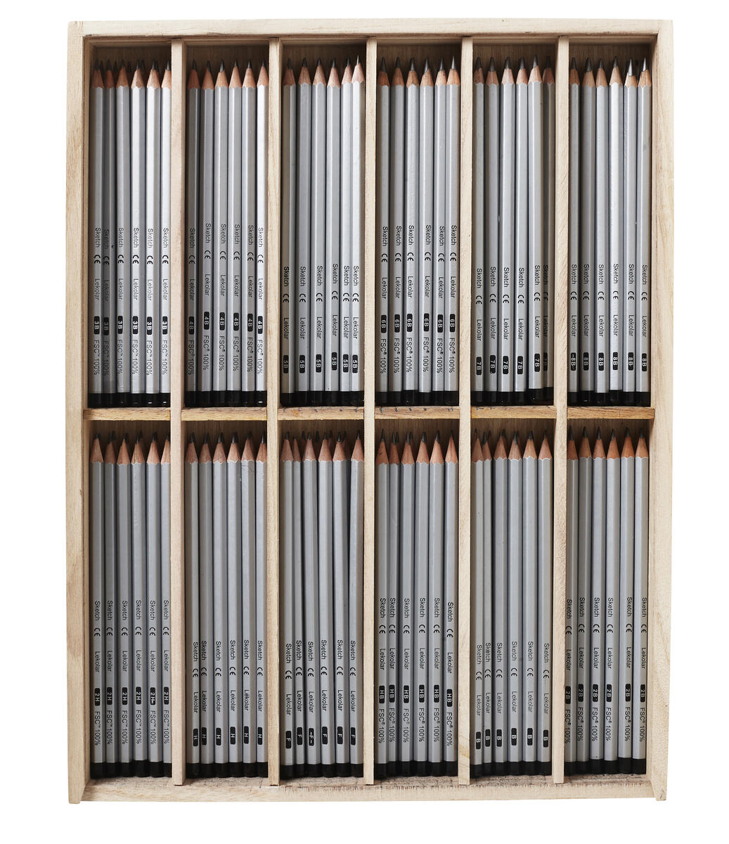 144 st/fp. Lekolar grafitpennor av hög kvalitet för blyertsteckning och teknisk ritning. Ingår hårdhetsgraderna 8B-2B, B, HB, F, H och 2H. 12 st pennor av varje hårdhetsgrad. Levereras i trälåda. PVC-fri.