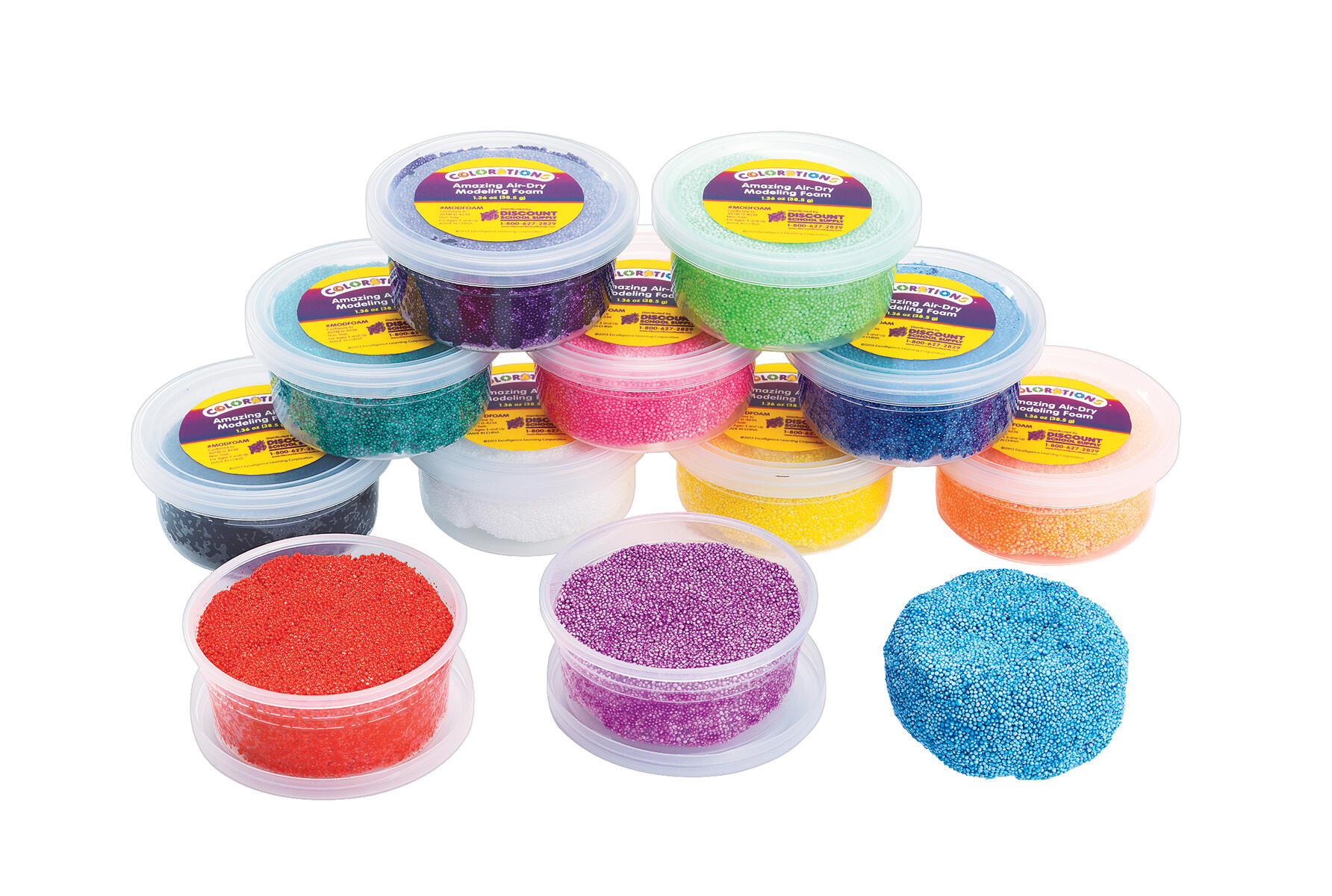 36x11 g/fp. Totalt ca 400 g (3,5 l). Storpack för hela gruppen. Materialet består av små styrofoamkulor med bindemedel. Materialet är lätt och mycket enkelt att forma och skulptera. Foamleran kladdar inte, fastnar inte på t.ex. bordsytor och lufttorkar inte utan kan användas om och om igen. Levereras i papplåda. Varje förpackning innehåller 2 st av vardera svart, blå, grön, orange, röd, lila, gul, vit och glittriga neonfärgerna blå, grön, chockrosa, rosa, orange, lila och gul. 6 st ofärgade glow-in-the-dark. PVC-fri. Från 3 år.