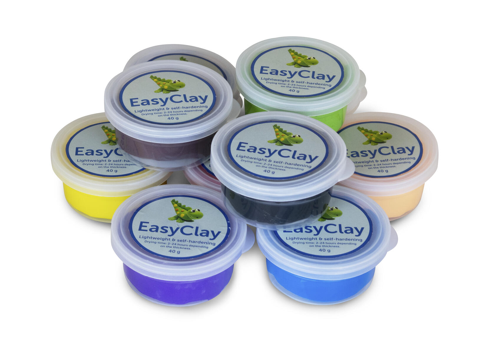 10x40 g/fp. Mjuk, smidig och lätt lera som lufttorkar på 2-24 timmar beroende på modellens storlek. Levereras i plastburk med lock och ska förvaras i lufttät förpackning. Innehåller: gul, röd, ljusblå, blå, grön, aprikos, lila, brun, vit och svart. PVC-fri. Från 3 år.