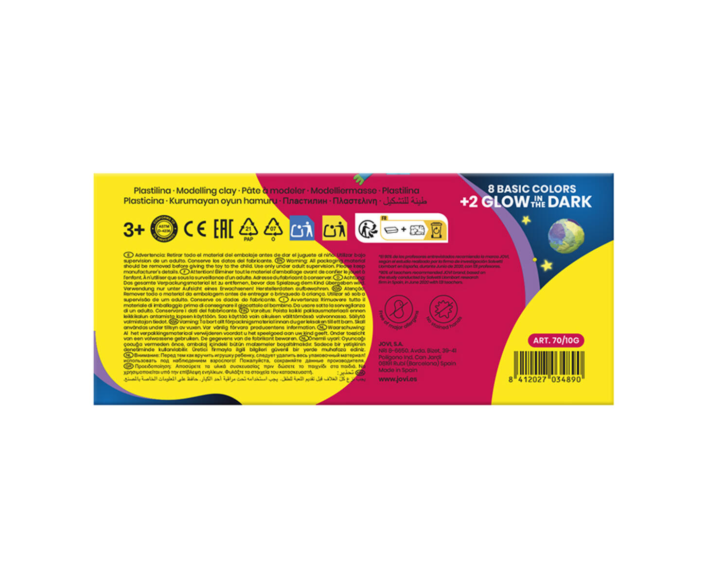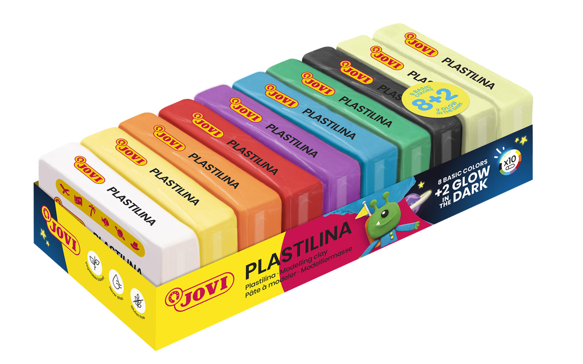 10 st/fp. Mjuk och smidig modellera. Värm den i händerna en stund så blir den lättarbetad även för de yngsta. Färgerna kan blandas. Smetar eller färgar inte av sig på hud, kläder eller underlag. Torkar ej. Kan inte brännas. Innehåller vit, gul, orange, röd, lila, blå, grön, svart samt 2 styck fluorescerande gula. Fri från gluten, soja och nötter. PVC-fri. Från 3 år.