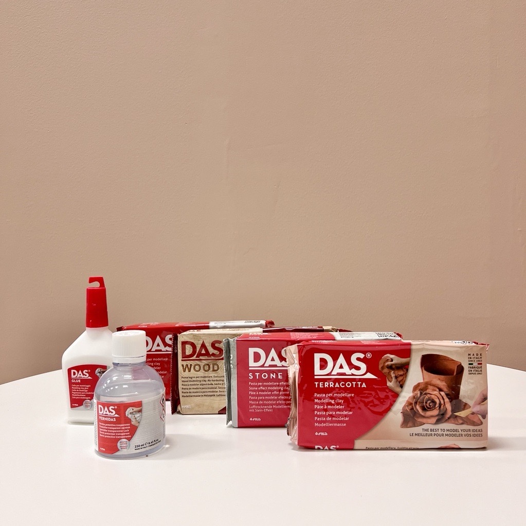 Paket med DAS lera i fyra olika varianter: vit, terrakotta, stone och wood. Innehåller även lack och lim. Levereras i praktiskt förvaringslåda. PVC-fri.