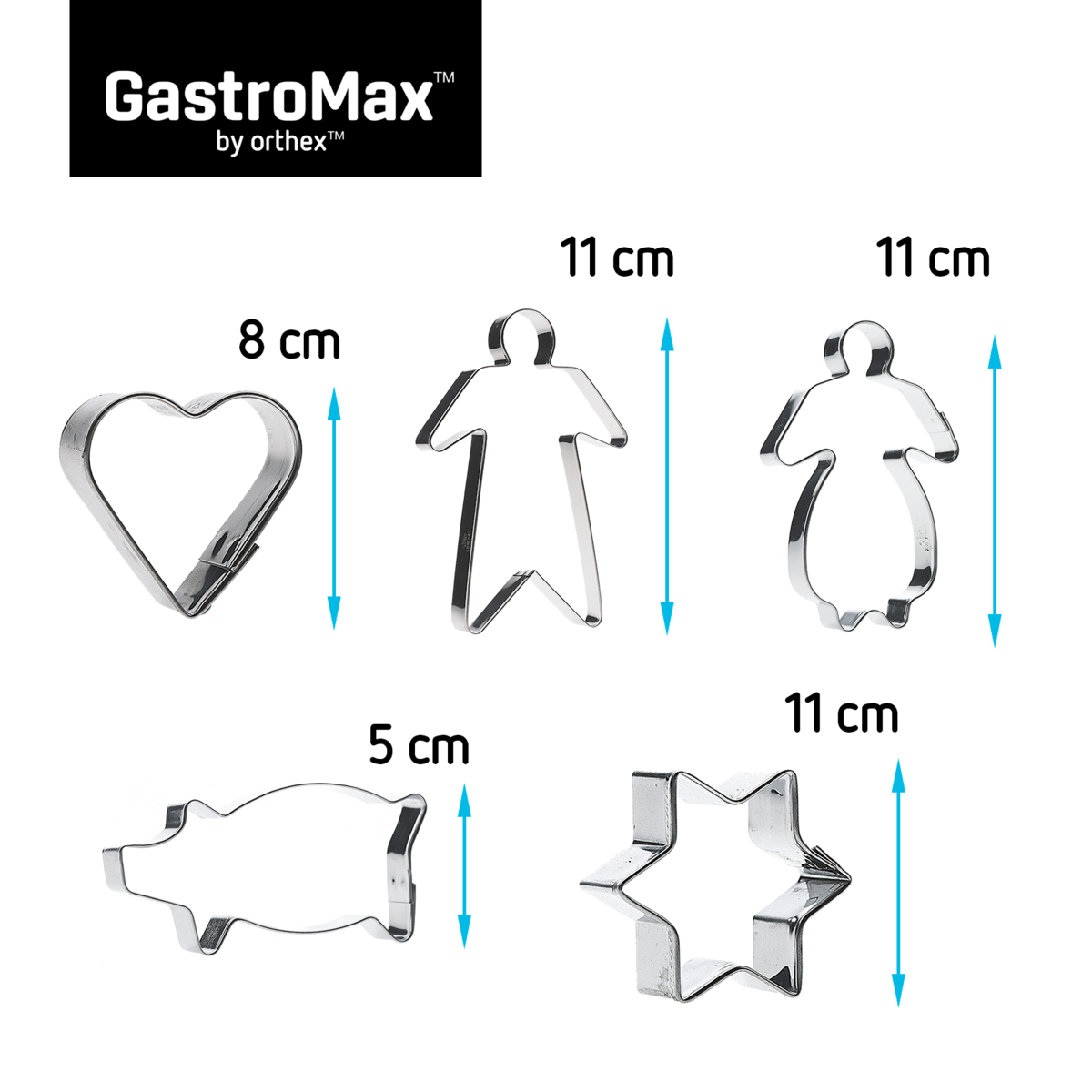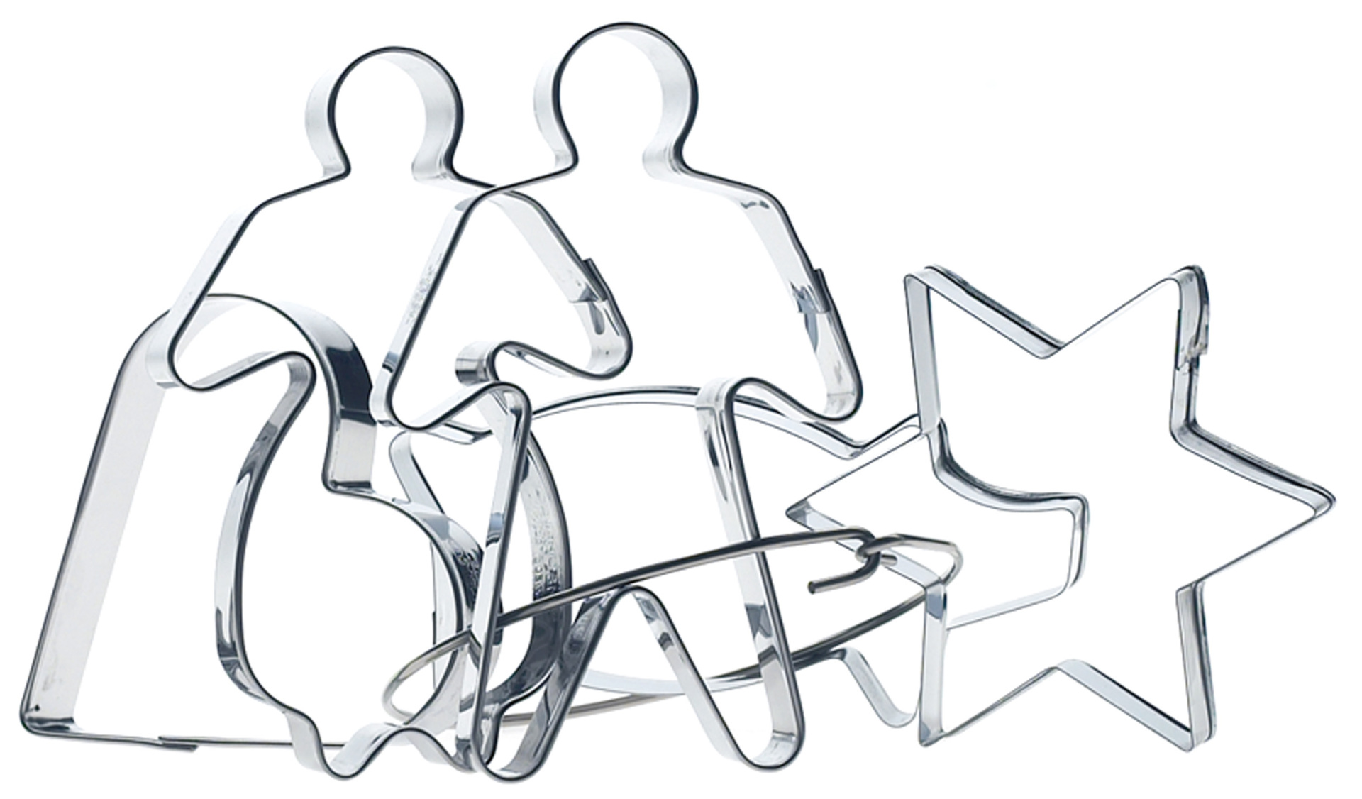 5 st/fp. Livsmedelsgodkända stansformar av rostfritt stål. Passar lika bra till arbete i lera som till kakbaket. Innehåller: gumma, gubbe, hjärta, stjärna och gris. Mått: 8-11 cm.