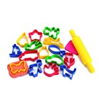 17 delar/fp. Lerformar med 16 olika figurer och kavel med fasta handtag i plast. Formarna är i fyra olika färger. Figurstolekar ca 5-8 cm höga, 5-9 cm breda. Kaveln mäter 21 cm, ø 4 cm. Formarna är tillverkade av ABS och kaveln av PE. PVC-fri.