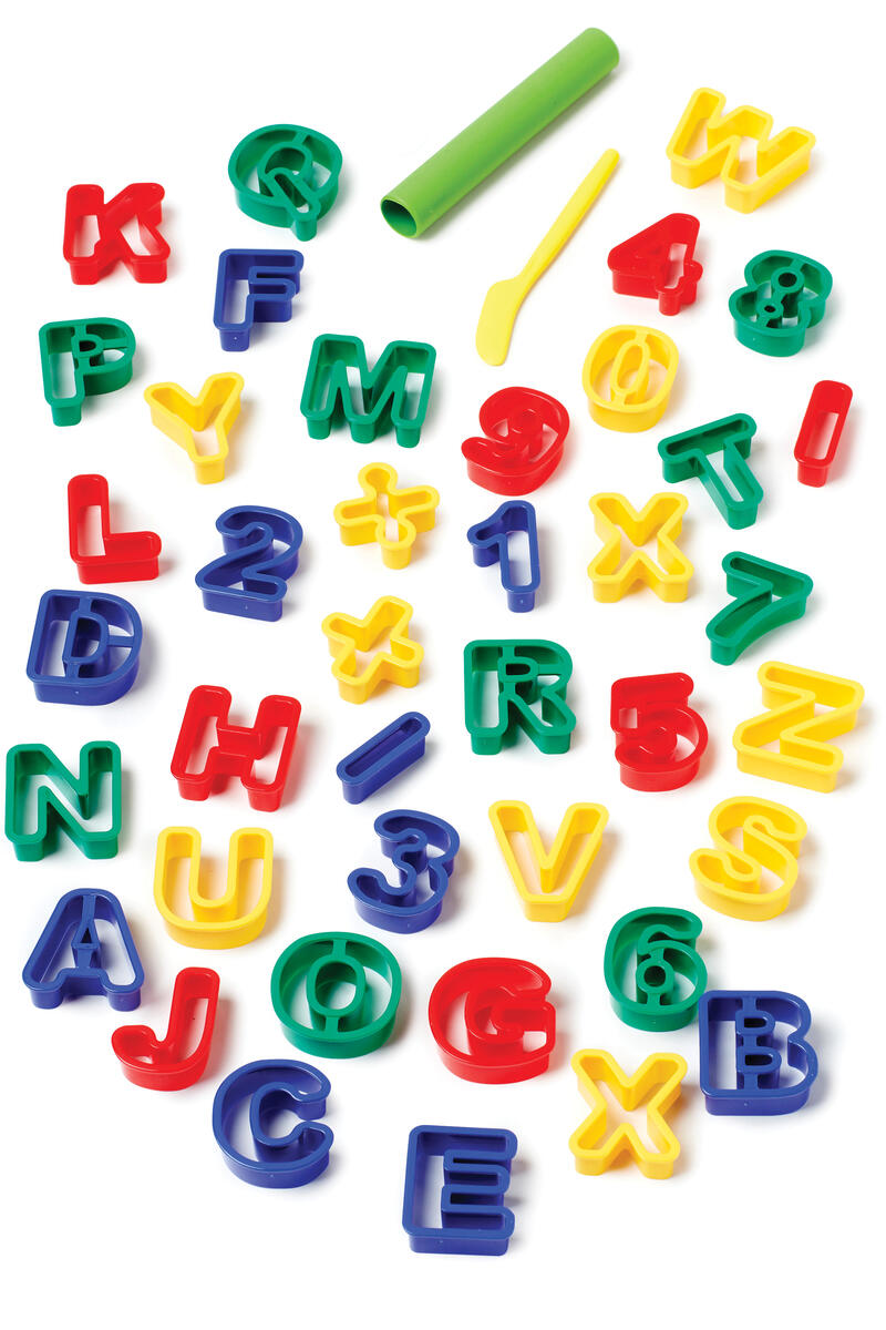42 delar/fp. Siffer- och bokstavsformar för lera. Innehåller 1 rullkavel, 1 plastkniv, siffrorna 0-9, tecknen för addition, subtraktion, multiplikation, division och bokstäverna A-Z. Siffror och bokstäver är ca 4 cm höga. Fyra blandade färger. Tillverkade av PP-plast. Ej för barn under 3 år.