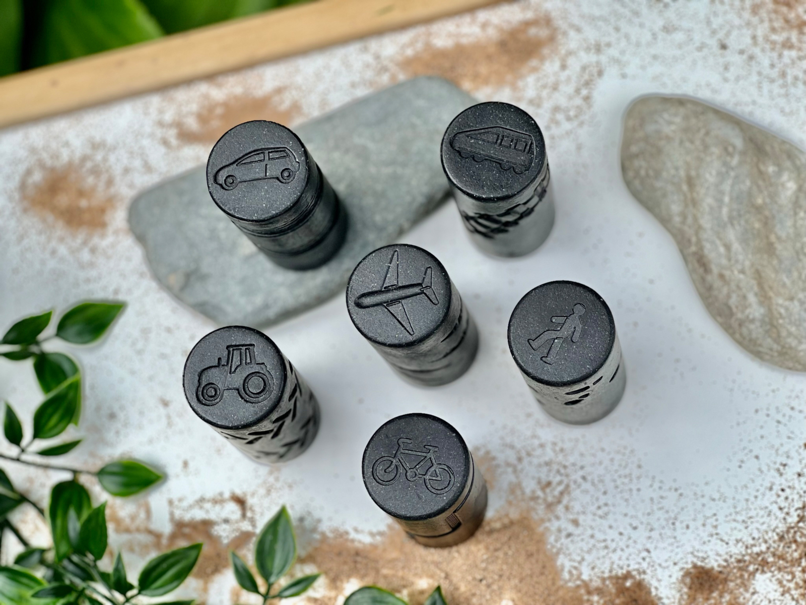 6 st/fp. Utveckla finmotorik och experimentera med olika tryck. De taktila mönstren som skapas ger massor av möjligheter att prata och utveckla ordförråd. Räkna fotgängarens steg, utveckla berättandet etc. Dessutom kan man starta samtal om olika sätt att resa. Innehåller: tåg och järnvägsspår, bil- traktor- och cykelspår, fotsteg och trappsteg. Tillverkade av sten- och hartsmix som gör att de passar bra både inom- och utomhus. PVC-fri. Från 2 år.