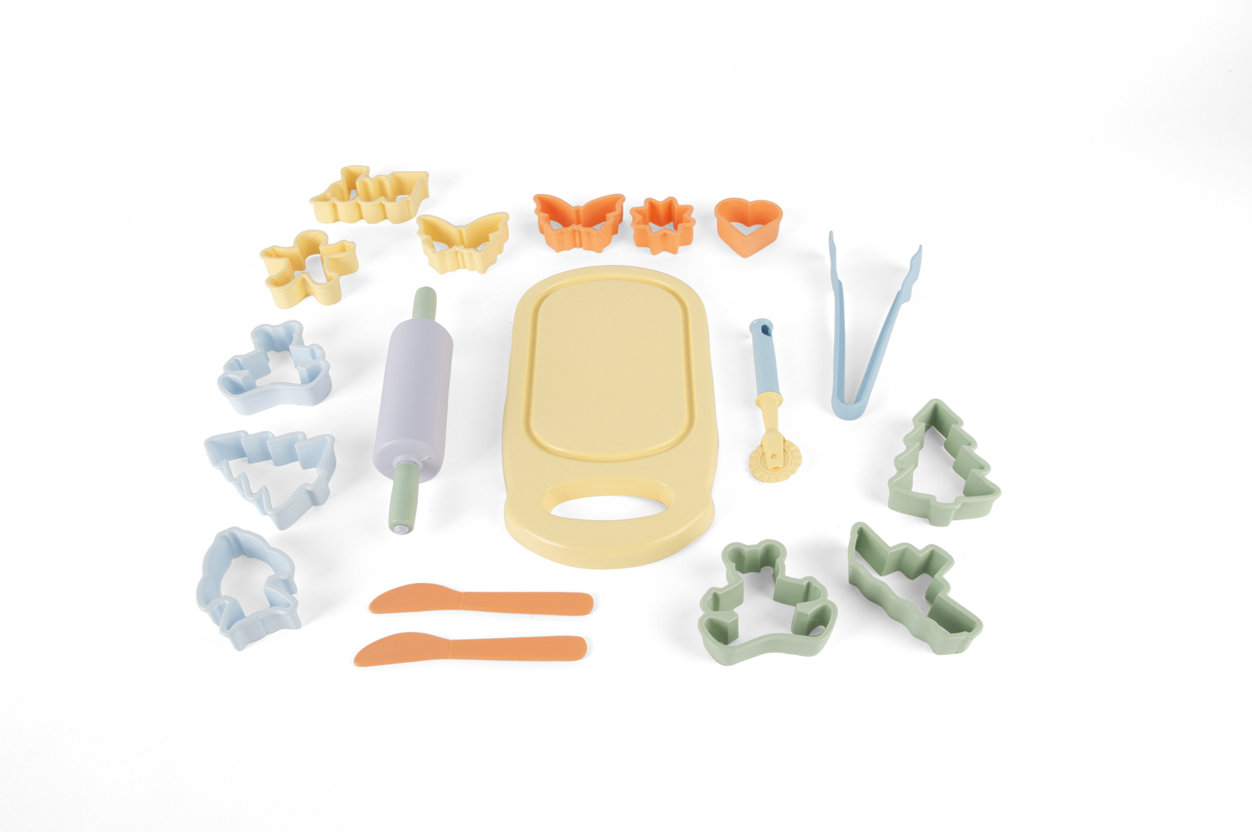 18 st/fp. Innehåller: 12 olika formar, 2 knivar, tång, sporre, kavel och arbetsbricka. Av återvunnen plast. Svanenmärkt, licensnummer 50950001. Från 2 år.