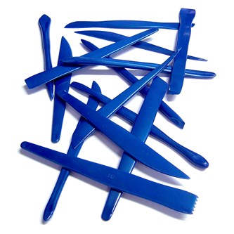 5 st/fp. Lerspatlar för modellering och skulptur. Av buxbomsträ som inte fäster mot leran. Innehåller 5 olika modeller: spatlar med rundad spets, diagonal, diagonal taggad, rak taggad, mjuka radier. Längd 15 cm.