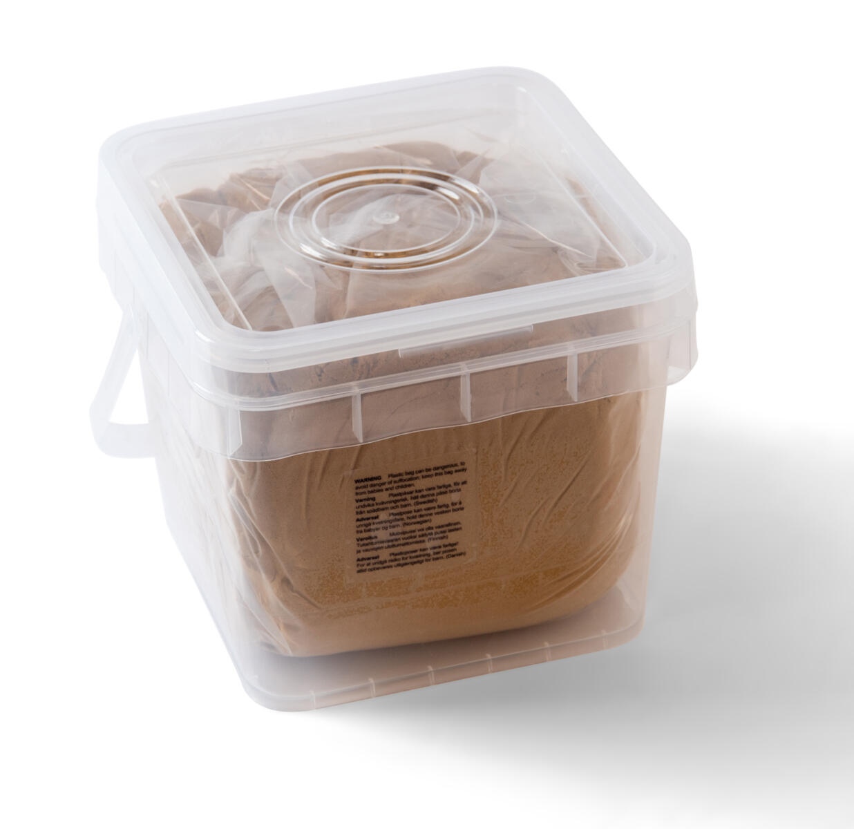 10 kg/fp. Mycket mjuk och lättformad leksand. Sandens mjukhet varierar beroende på luftfuktighet. För mjukare sand, spraya på lite vatten och arbeta den mjuk, se video på web. Sanden är packad i transparent back med återförslutningsbart lock. Glutenfri och utan konserveringsmedel. Sanden består av 96 % sand samt bindemedel. PVC-fri. Godkänd från 3 år, men rekommenderas från 5 år.