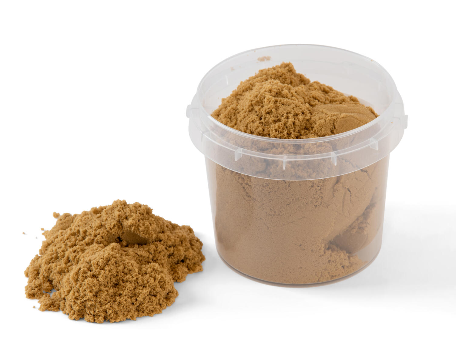 2 kg/fp. Mycket mjuk och lättformad leksand. Sanden är packad i transparent hink med återförslutningsbart lock. Hinken kan användas som form för slott/borg. Sandens mjukhet varierar beroende på luftfuktighet. För mjukare sand, spraya på lite vatten och arbeta den mjuk, se video på web. Glutenfri och utan konserveringsmedel. Sanden består av 96 % sand samt bindemedel. PVC-fri. Godkänd från 3 år, men rekommenderas från 5 år.