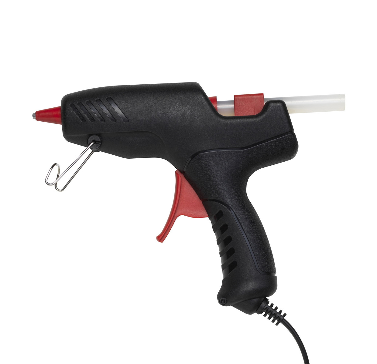 1 st/fp. Större och kraftigare limpistol som fungerar väl till trä, kork, kartong, papper, plast, keramik, sten, metall och läder men ej till styrolit. Metallspetsen når temperaturer uppemot 200 °C, så var försiktig. Verktyget är ergonomiskt utformat, lätt att arbeta med och utrustat med en 175 cm lång sladd. Framtill finns en metallbygel som går att fälla ned om man vill ha limpistolen stående eller hänga upp den säkert efter användning. 2 st 10 mm limstavar utan animaliska ingredienser ingår. Längd 18 cm.