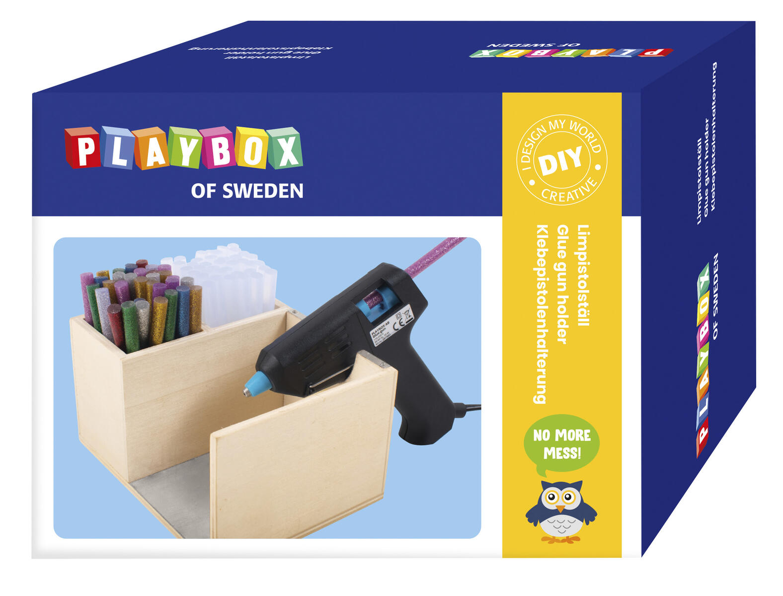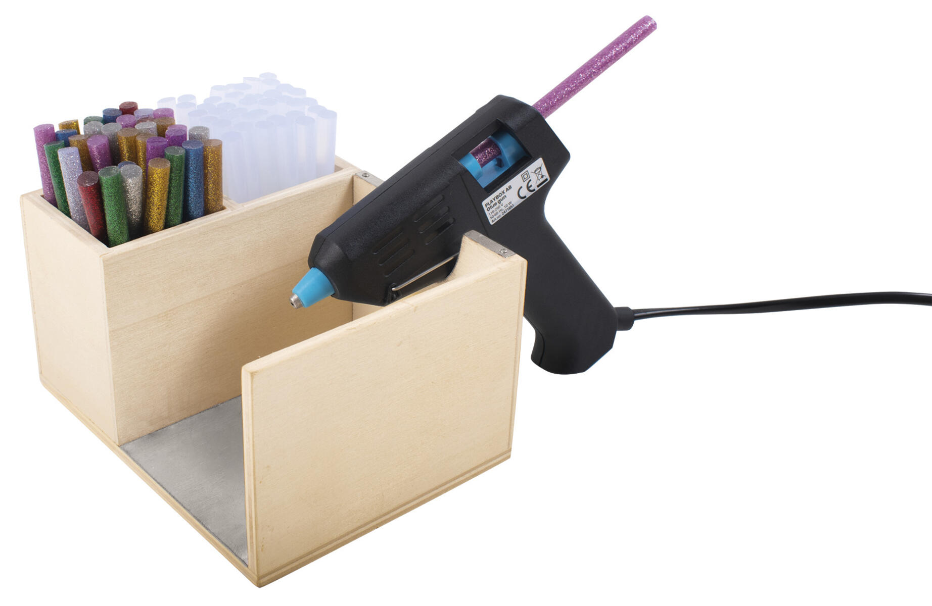 När man behöver ställa ifrån sig limpistolen under arbetet kommer detta ställ hålla limpistolen stadig. För både de små och de stora limpistolerna. 2 fack. Mått 14,5x11 cm. Av trä och metall.