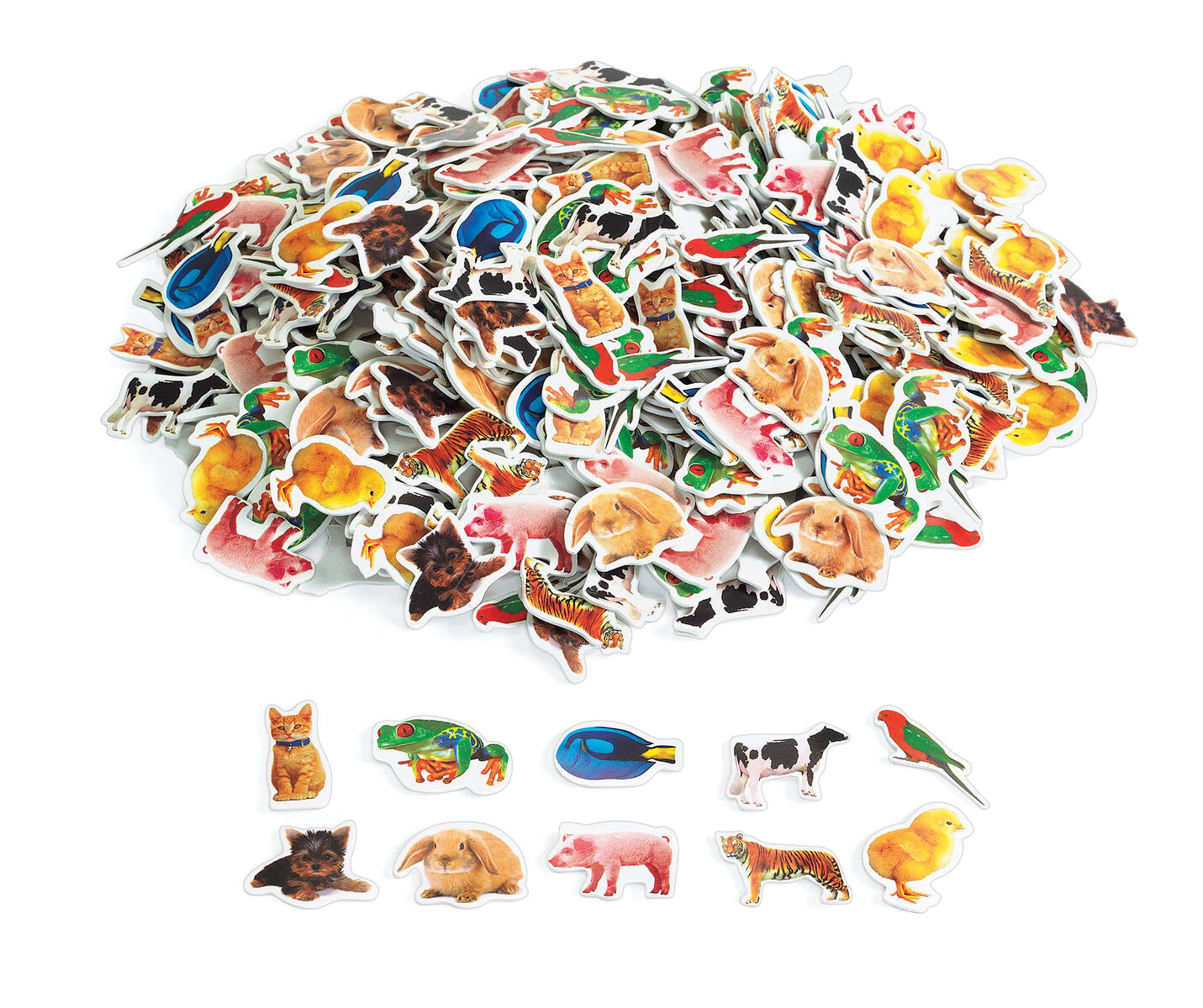 500 st/fp. Tjocka, självhäftande EVA-klistermärken med djurfotomotiv. På bilderna återfinns fåglar, fiskar, grodor, katter, hundar, kycklingar, kossor, grisar, kaniner och tigrar. Blandade storlekar 3,8–5 cm. Tjocklek ca 3 mm. Skyddsplast som är lätt att avlägsna på baksidan. PVC-fri. Från 3 år.