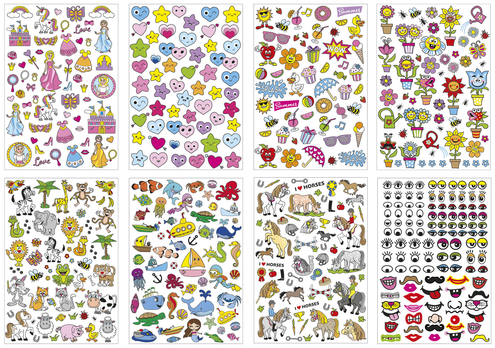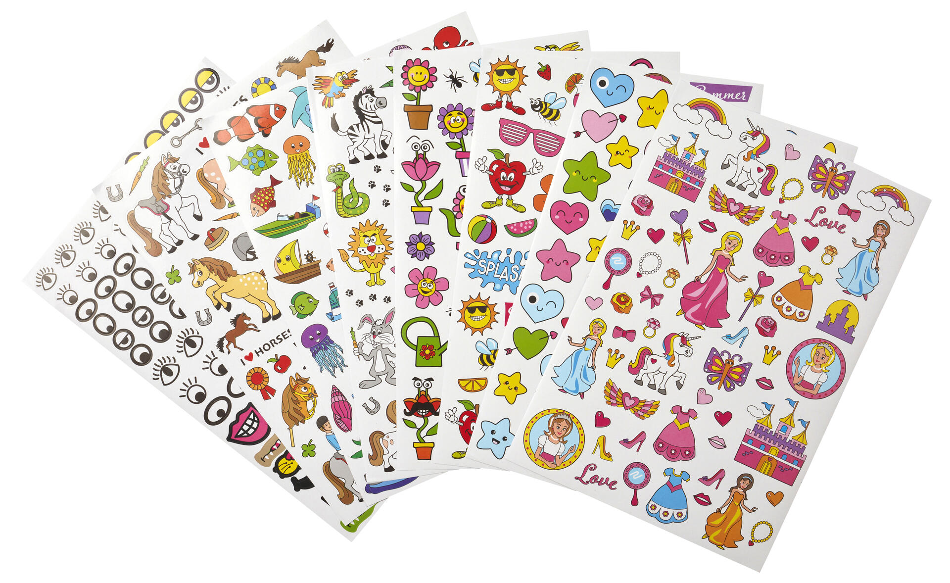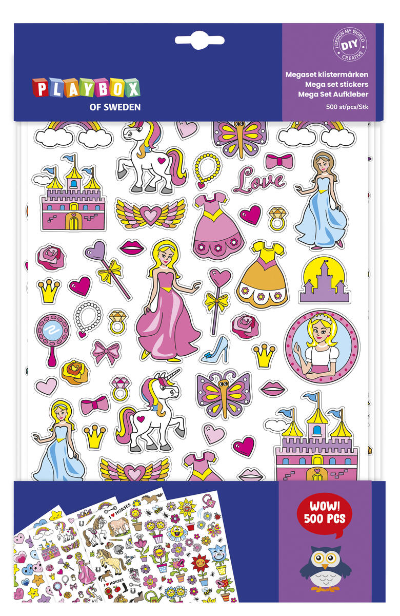 500 st/fp. 8 ark med stickers i olika storlekar och motiv som prinsessor, figurer, blommor, djur och båtar. Mått 10-78 mm. Syrafria. Av papper. PVC-fri.