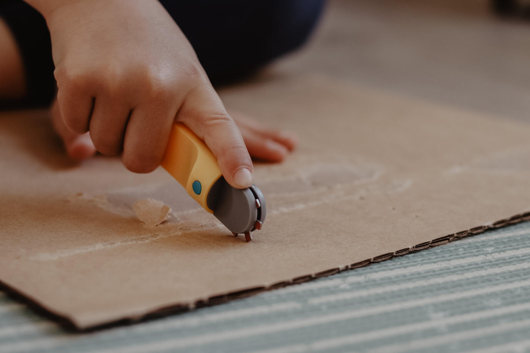 Såg med blad utan vassa kanter för att såga i kartong. Kanterna på kartongen blir mjuka så att man inte skär sig. Använd handtaget på sågen för att stansa ut hål till skärlinje. Från 5 år. PVC-fri.