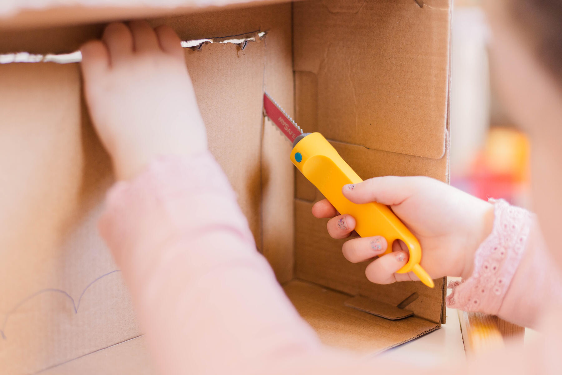 Såg med blad utan vassa kanter för att såga i kartong. Kanterna på kartongen blir mjuka så att man inte skär sig. Använd handtaget på sågen för att stansa ut hål till skärlinje. Från 5 år. PVC-fri.