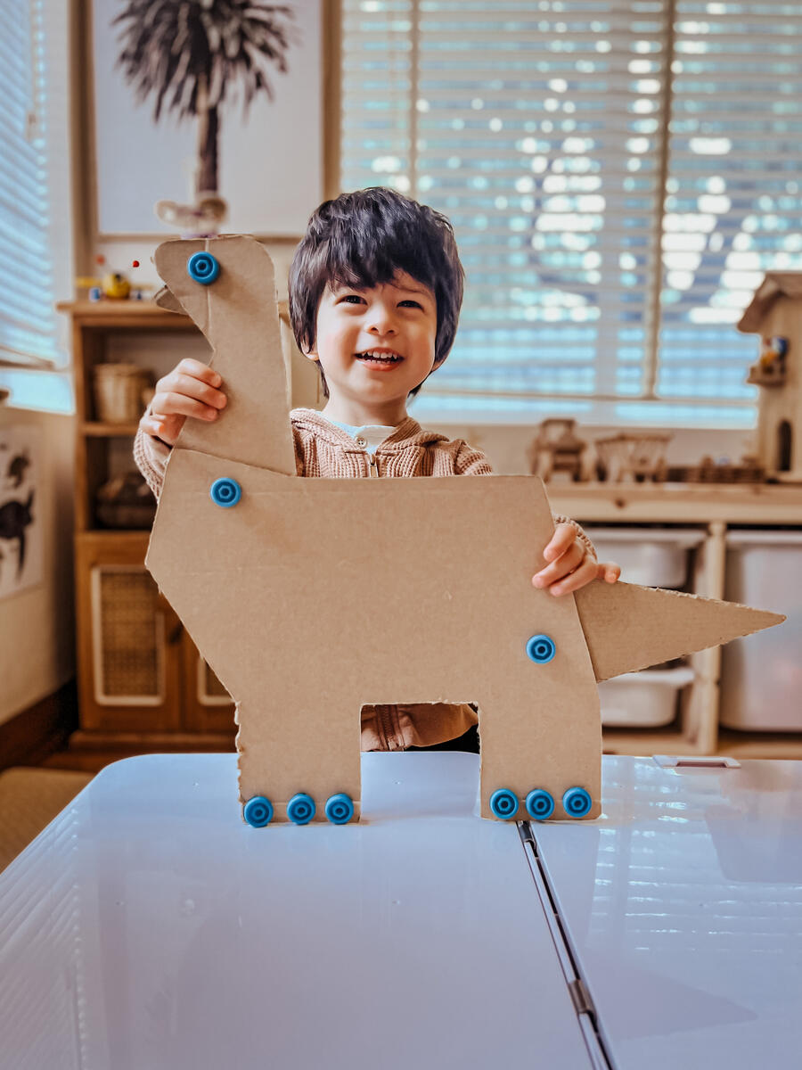 Såg med blad utan vassa kanter för att såga i kartong. Kanterna på kartongen blir mjuka så att man inte skär sig. Använd handtaget på sågen för att stansa ut hål till skärlinje. Från 5 år. PVC-fri.