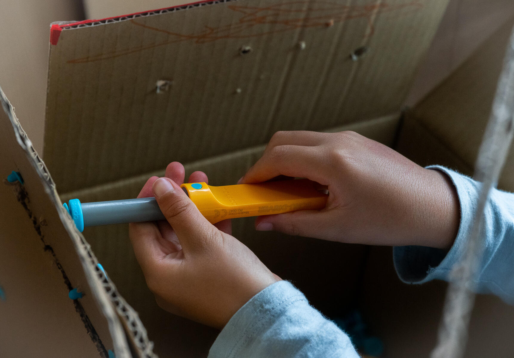 Såg med blad utan vassa kanter för att såga i kartong. Kanterna på kartongen blir mjuka så att man inte skär sig. Använd handtaget på sågen för att stansa ut hål till skärlinje. Från 5 år. PVC-fri.