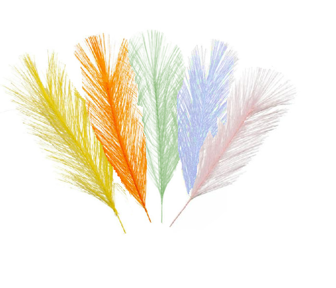68 g/fp. Syntetiska fjädrar av polyester på ståltråd. Innehåller färgerna gul, grön, blå, orange och rosa. Längd 15 och 22 cm. PVC-fri.