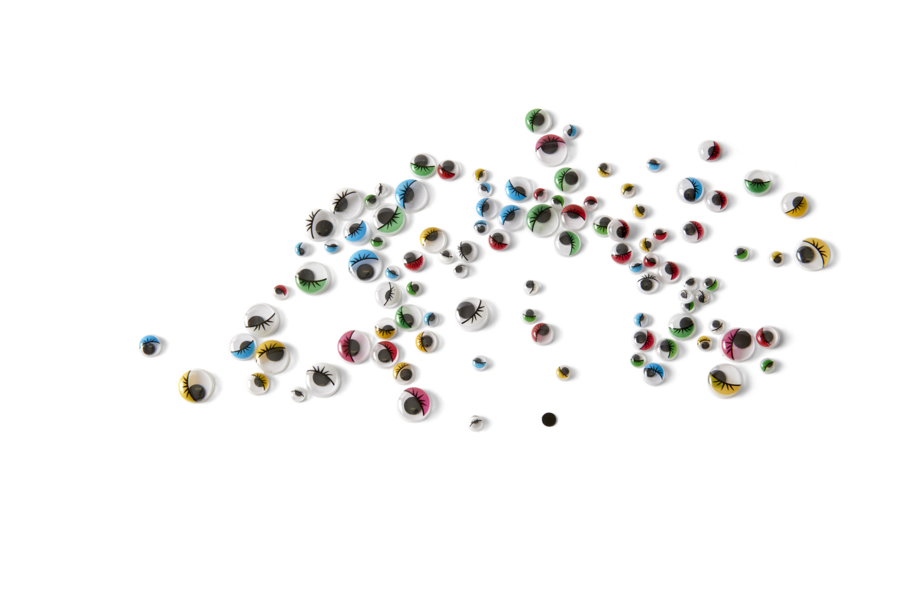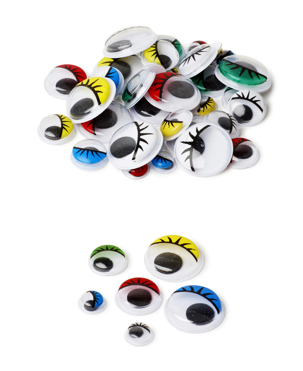 140 st/fp. Vita plastögon med svarta, rörliga pupiller och fransar. Ej självhäftande. Tre storlekar, 70 st ø 7 mm, 50 st ø 10 mm och 20 st ø 15 mm. Av PET.