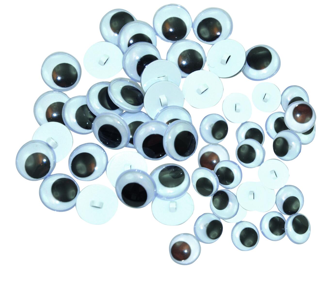 150 st/fp. Vita plastögon med svart rörlig pupill. Mix av självhäftande och med ögla på baksidan. Storleksspann ø 10–15 mm. Av PET.