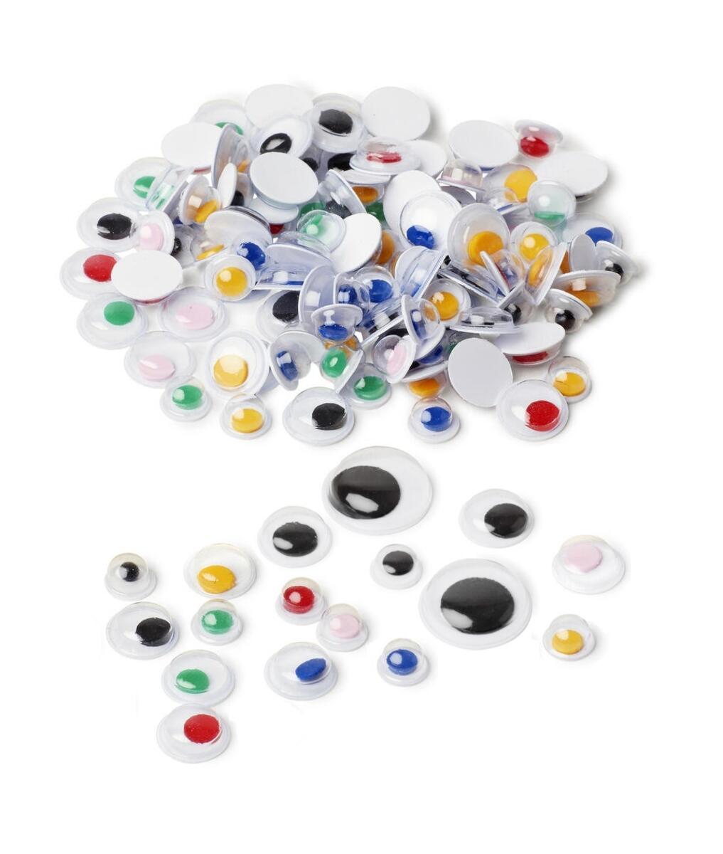 150 st/fp. Vita plastögon med svart rörlig pupill. Mix av självhäftande och med ögla på baksidan. Storleksspann ø 10–15 mm. Av PET.