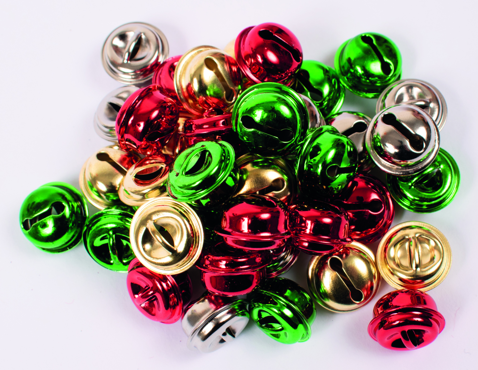 40 st/fp. Runda bjällror i guld, silver och grönt. Med boll inuti som ger ett plingande ljud. Fästögla upptill. Mått ø 15 mm.