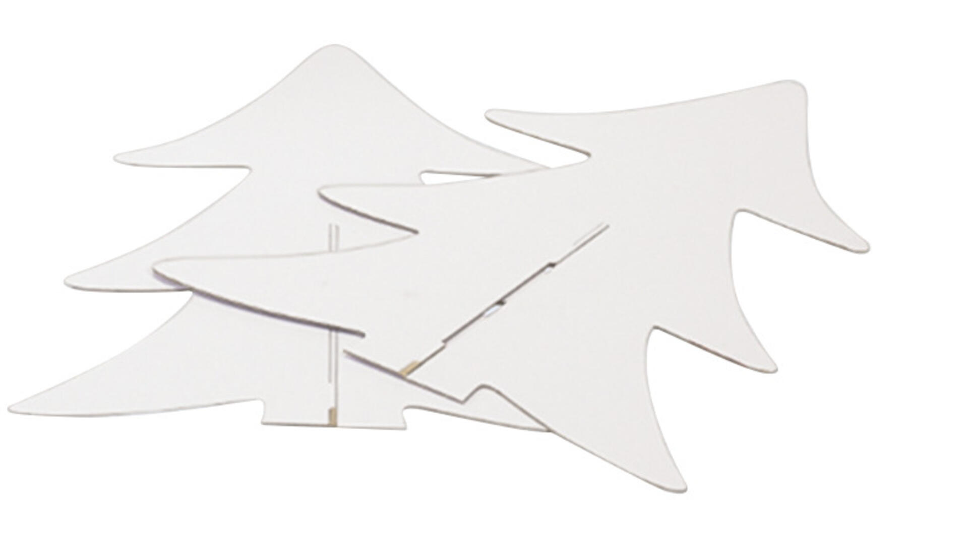 12 st/fp. Granar i vit, stadig kartong som sätts ihop 2 och 2 till fristående juldekorationer. Delarna har spår som skjuts i varandra. Kan målas eller dekoreras på annat sätt. Varje del mäter H25xB20 cm. PVC-fri.