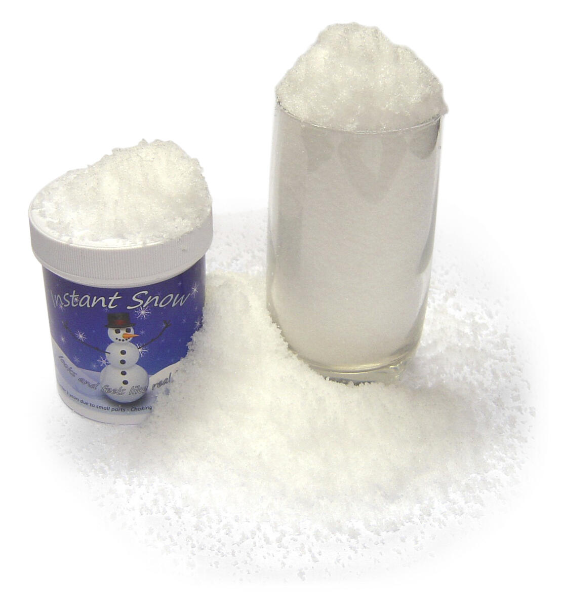 100 g/fp ger ca 8 liter snö. Gör din egen snö med snöpulver som sväller ca 100 ggr sin egen volym i vanligt vatten. När vattnet avdunstar krymper pulvret till ursprunglig volym och kan användas igen. Proportioner och instruktioner på förpackningen. Skopa för portionering medföljer. Ska inte förtäras. Undvik kontakt med ögon. Får inte hällas ut i avloppet. Från 3 år.