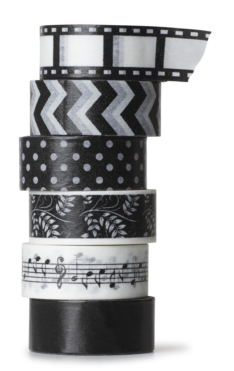6 rullar/fp. 3 m tejp/rulle. 15 mm bred. Hobbytejp med blandade mönster i svarta och vita toner. Syrafri.