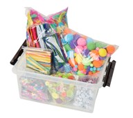 Stort set med allt du behöver för kreativt skapande eller för arbete med loose parts. Innehåller 80 piprensare, 600 plastögon i olika storlekar, 200 g paljetter i olika färger och former, 200 g facettslipade paljetter, 100 g fjädrar, 500 g knappar, 500 st pompom i blandade storlekar och färger, 230 st färgade glasspinnar och 90 st glittriga piprensare. Allt levereras i en praktisk plastback, perfekt för att flytta med i verksamheten, både inom- och utomhus. Mått på backen 40x30x19 cm. Från 3 år. PVC-fri.
