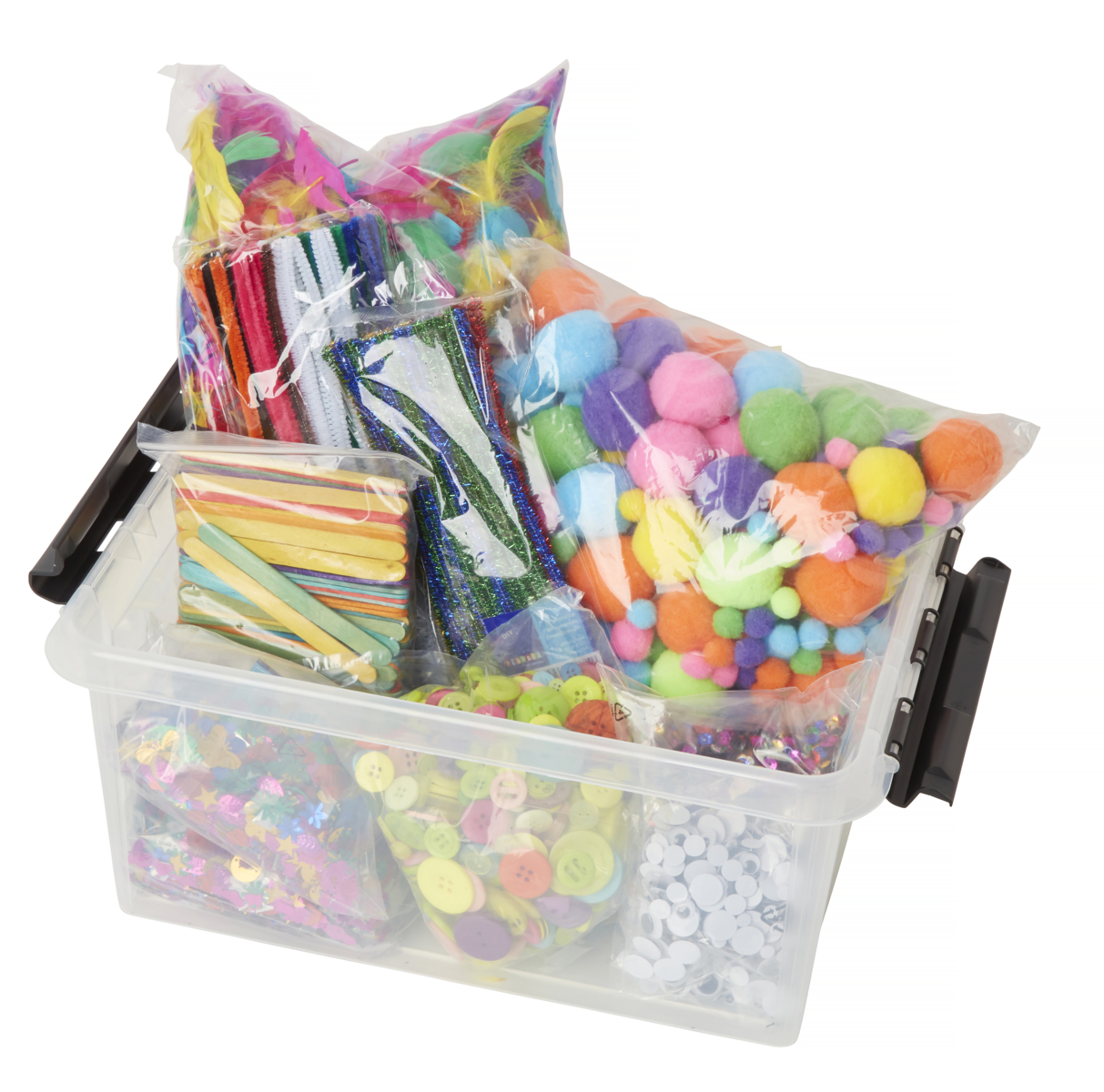 Stort set med allt du behöver för kreativt skapande eller för arbete med loose parts. Innehåller 80 piprensare, 600 plastögon i olika storlekar, 200 g paljetter i olika färger och former, 200 g facettslipade paljetter, 100 g fjädrar, 500 g knappar, 500 st pompom i blandade storlekar och färger, 230 st färgade glasspinnar och 90 st glittriga piprensare. Allt levereras i en praktisk plastback, perfekt för att flytta med i verksamheten, både inom- och utomhus. Mått på backen 40x30x19 cm. Från 3 år. PVC-fri.