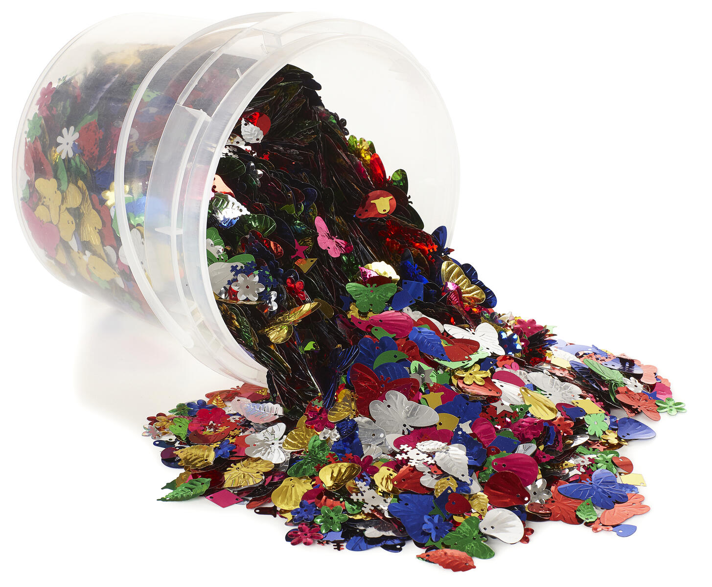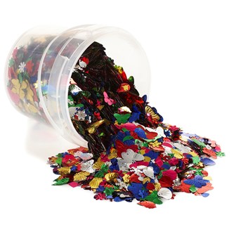 500 g/fp. Paljetter i blandade färger och former. Mått: ø 1-4 cm. Levereras i hink med lock för praktisk förvaring. Av PET. PVC-fri.