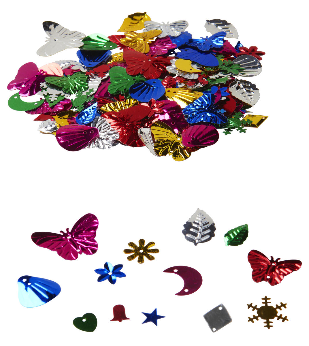 100 g/fp. En mix med stora paljetter i olika former och färger. Mått 1,5-4 cm. Av PET. PVC-fri.