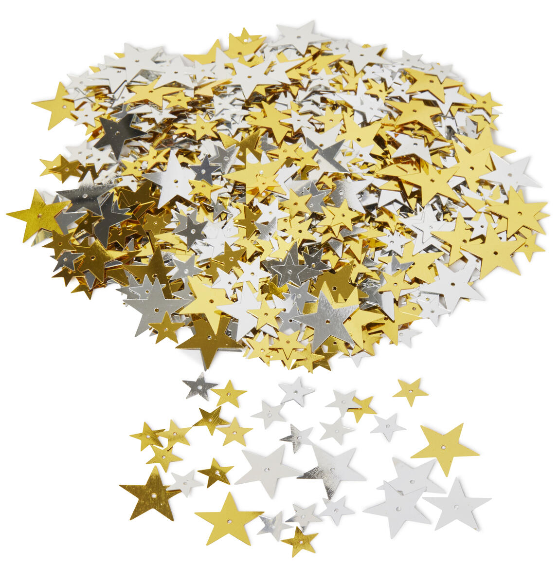 100 g/fp. Stjärnpaljetter i guld och silver i flera olika storlekar. Mått ø 10-18 mm. Av PET. PVC-fri.