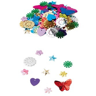 250 g/fp. Paljetter i blandade färger och former. Mått: 10-20 mm. Av PET.