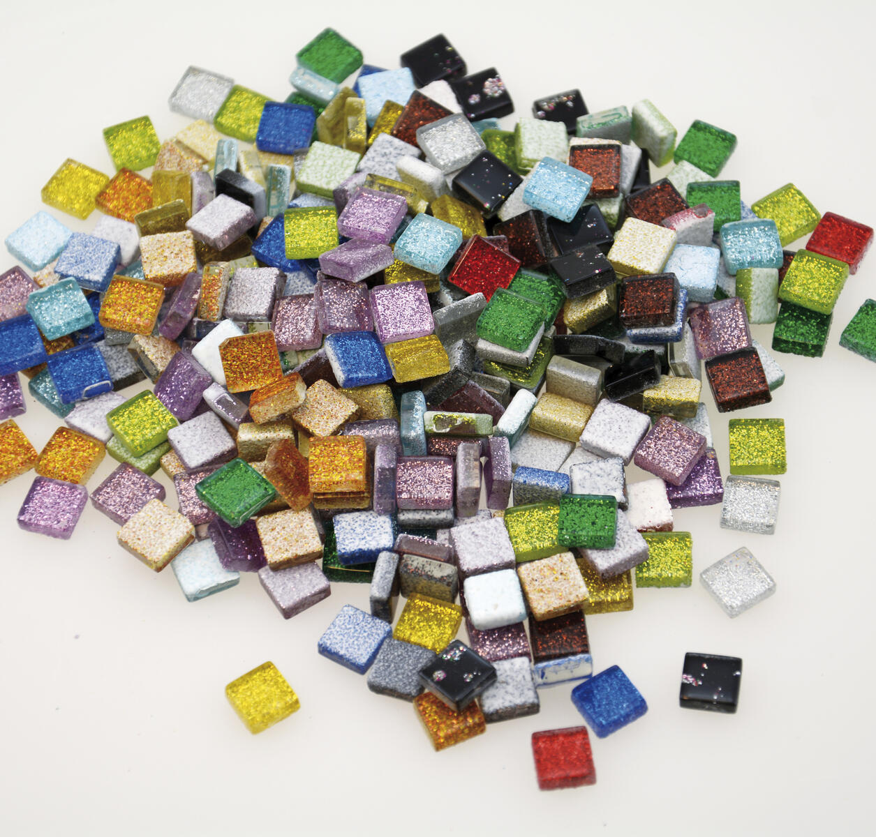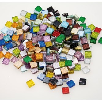 300 st/fp. Glasmosaik i glittriga färger. Mått 10x10x4 mm. Av glas.